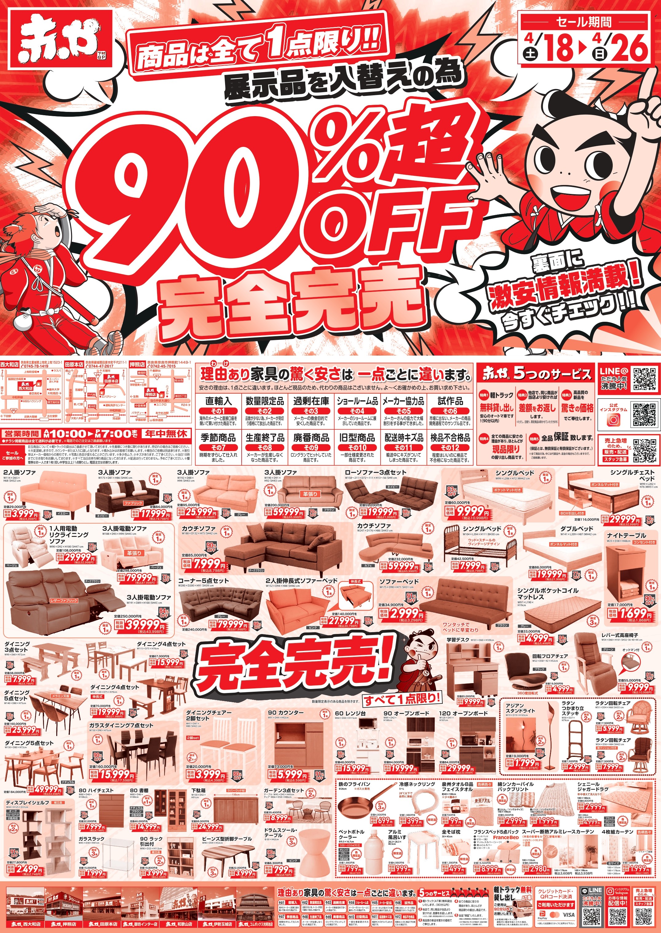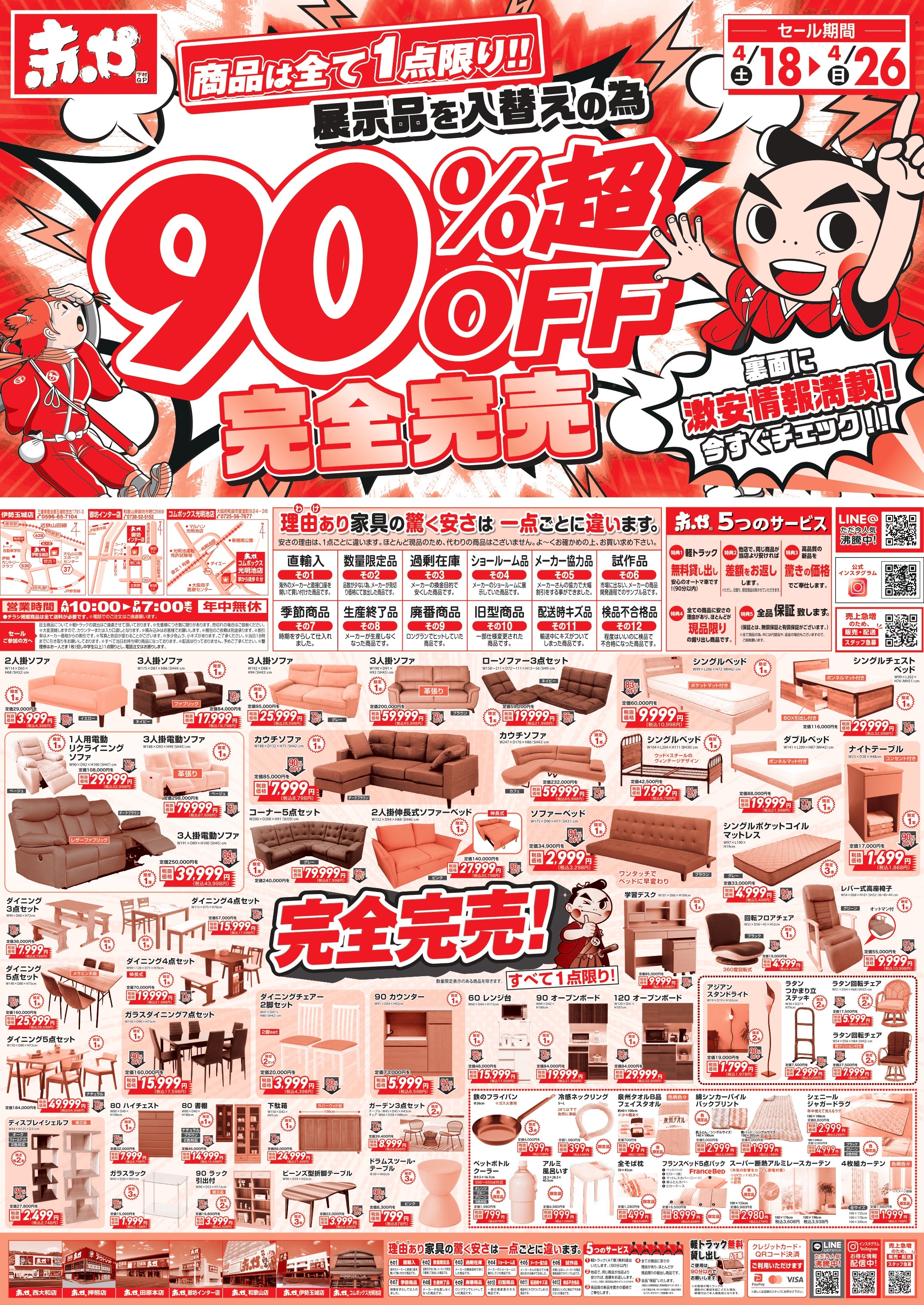 ソファー、ベッド、ダイニングセット・収納家具を「理由あり」の安さで提供。